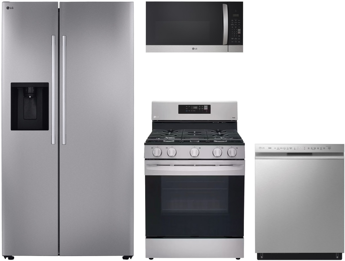 LG 4 Piece Stainless Steel Kitchen Package with side-by-side refrigerator, built in dishwasher, freestanding gas range and over the range microwave.Read More