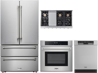 Thor Kitchen® 4 Piece Stainless Steel Kitchen Package with a French door refrigerator, gas rangetop, single electric wall oven and built in dishwasher.Read More